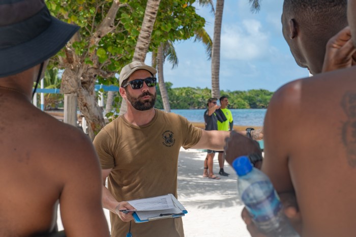 Un plongeur-démineur de l'Unité de plongée de la Flotte (Atlantique) encadre les membres de la Force opérationnelle des Caraïbes pendant l'exercice TRADEWINDS 22 (Belize City, Belize, 2022).