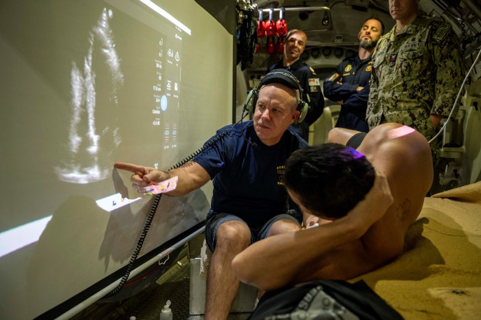 Des plongeurs-démineurs du Groupe expérimental de plongée et sous-marine (EDUG) participent à une étude sur les embolies gazeuses veineuses aux côtés du personnel de la US Navy (Panama City Beach, États-Unis, 2024).