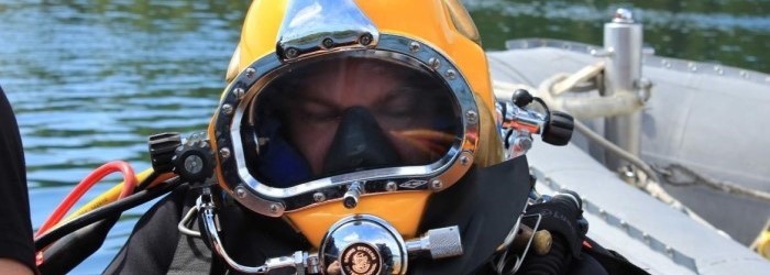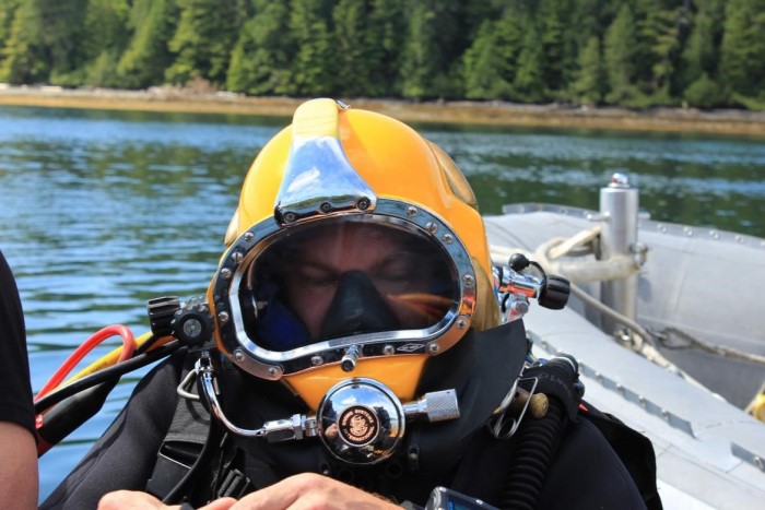 Un plongeur-démineur enfile un appareil respiratoire alimenté en surface (SSBA) lors d'opérations de déminage de munition non explosée provenant de l'épave du NCSM THEIPVAL (Barkley Sound, Colombie-Britannique, 2017).