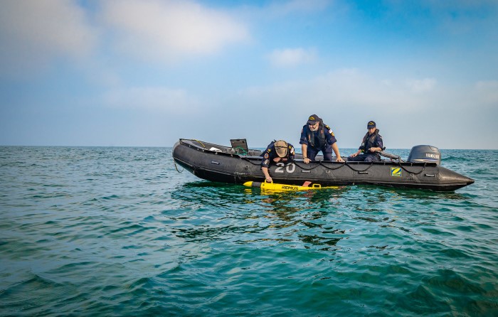 Des marins du NCSM SUMMERSIDE lancent un véhicule sous-marin autonome (VSA) REMUS lors d'opérations de neutralisation d'engins explosifs historiques dans la Manche (Le Tréport, France, 2022).