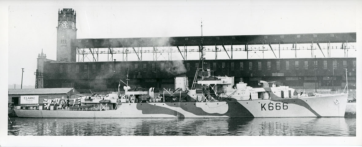 La frégate NCSM Hallowell de la classe River fut ainsi nommée parce que le nom qu’elle devait avoir, celui de la ville de Picton (Ontario), ressemblait trop à celui du NCSM Pictou. Mis en service le 8 août 1944 à Montréal (Québec), le NCSM Hallowelll arriva à Halifax (Nouvelle-Écosse), le 3 septembre et partit le mois suivant pour les Bermudes pour y faire sa croisière d’endurance. À son retour au début de novembre, il fut affecté au Groupe d’escorte C-1 et, en décembre, en devint navire amiral. Il demeura au sein de ce groupe jusqu’à la fin des hostilités en Europe. Le 28 novembre, le navire quitta le port de St. John’s (Terre-Neuve), pour escorter le convoi HX.322; par la suite, il fut entièrement affecté à la protection des convois dans l’Atlantique Nord. Au début de juin 1945, le NCSM Hallowell quitta Greenock, en Écosse, pour rentrer au Canada et, en juillet et en août, il transporta des troupes de St. John’s au Canada.