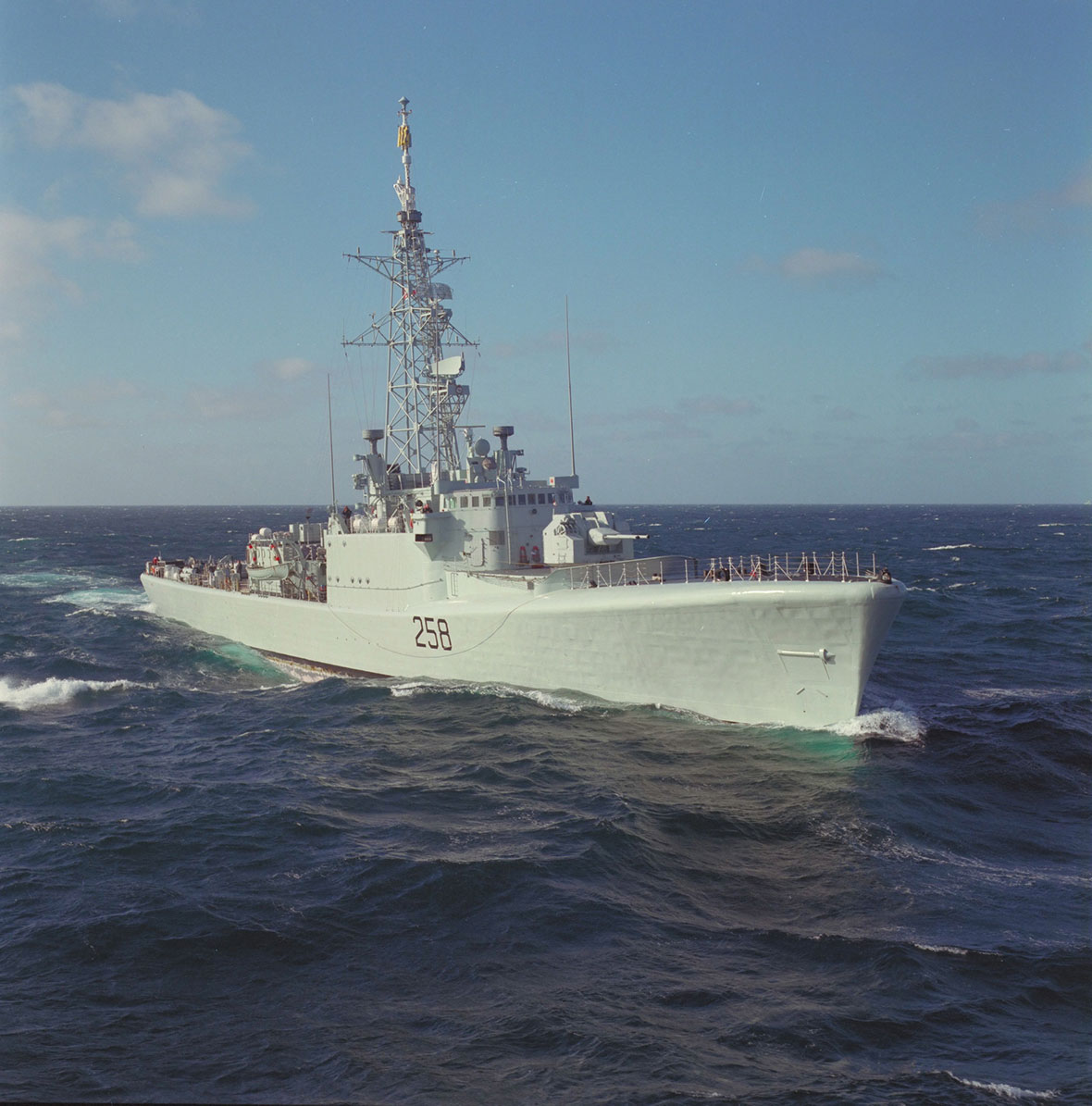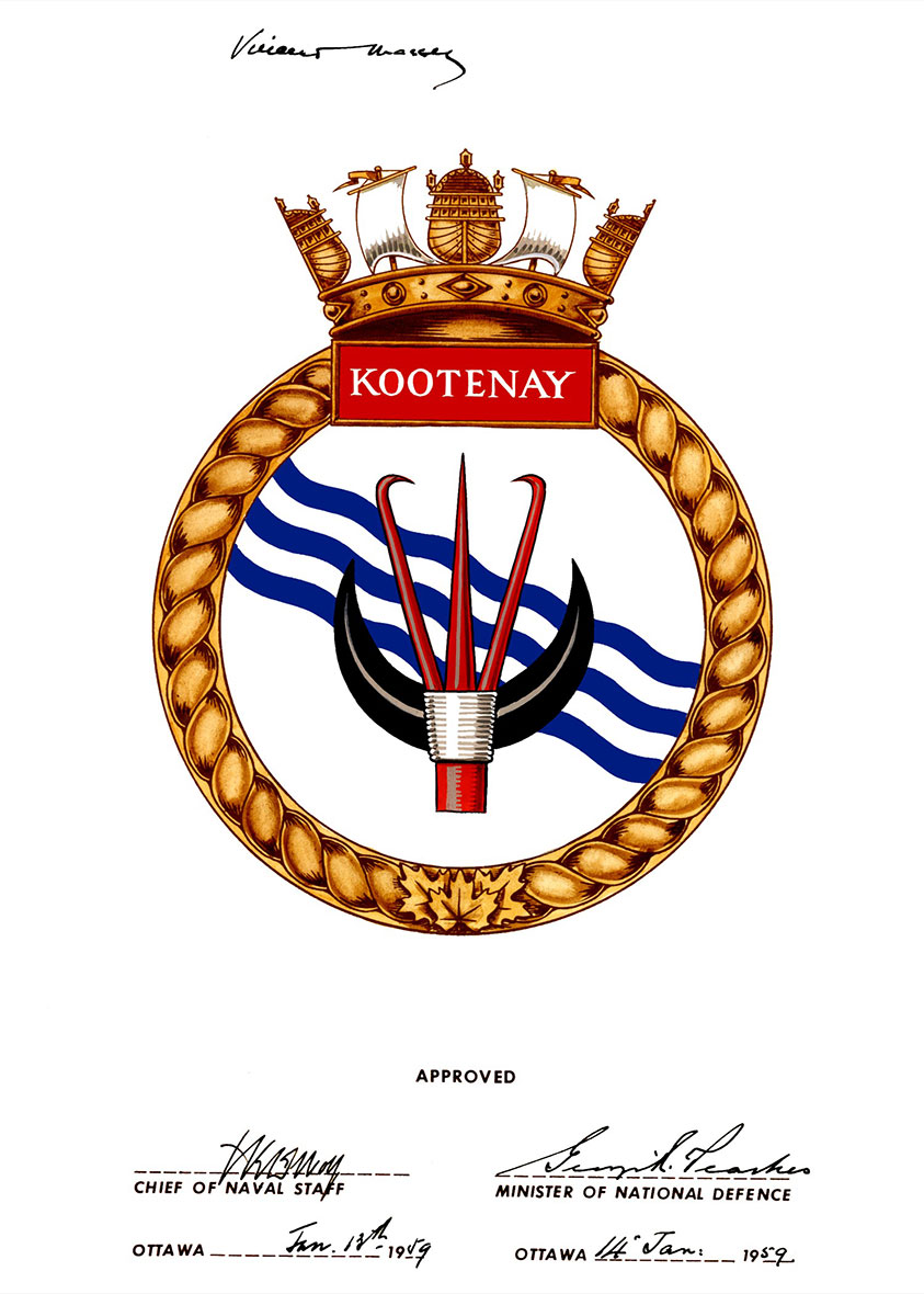 Premier destroyer escorte de la classe Restigouche à être lancé, le Kootenay fut mis en service le 7 mars 1959 et fut transféré sur la côte Est après sa croisière d’endurance. Il fut un des 2 navires de guerre chargés d’escorter le yacht royal Britannia lorsque Sa Majesté la reine Elizabeth vint inaugurer la Voie maritime du Saint-Laurent en 1959. Le 23 octobre 1969, en eaux européennes, l’explosion d’une boîte de transmission tua 9 membres d’équipage et en blessa 53 autres. Ce fut le pire accident survenu en temps de paix pour la Marine royale canadienne. Pendant les réparations, il fut décidé de convertir le Kootenay en destroyer de classe Restigouche modifiée et c’est à ce titre qu’il fut remis en service le 7 janvier 1972. Transféré sur la côte Ouest, le Kootenay arriva à Esquimalt (Colombie-Britannique) le 12 février 1973. Du 3 au 7 juin 1990, le Kootenay visita Vladivostok en tant que membre d’un groupe opérationnel canadien, le premier à le faire depuis la Seconde Guerre mondiale. Pendant l’été 1994, il contribua à l’application des sanctions imposées contre Haïti par les Nations Unies. Son dernier périple l’amena au large du cap Horn pour un exercice naval de 2 mois appelé UNITAS. Le 18 décembre 1995, le Kootenay fut désarmé et, le 6 novembre 2000, il partit d’Esquimalt en remorque et fut sabordé pour créer un récif artificiel au large de Puerto Vallarta, au Mexique.