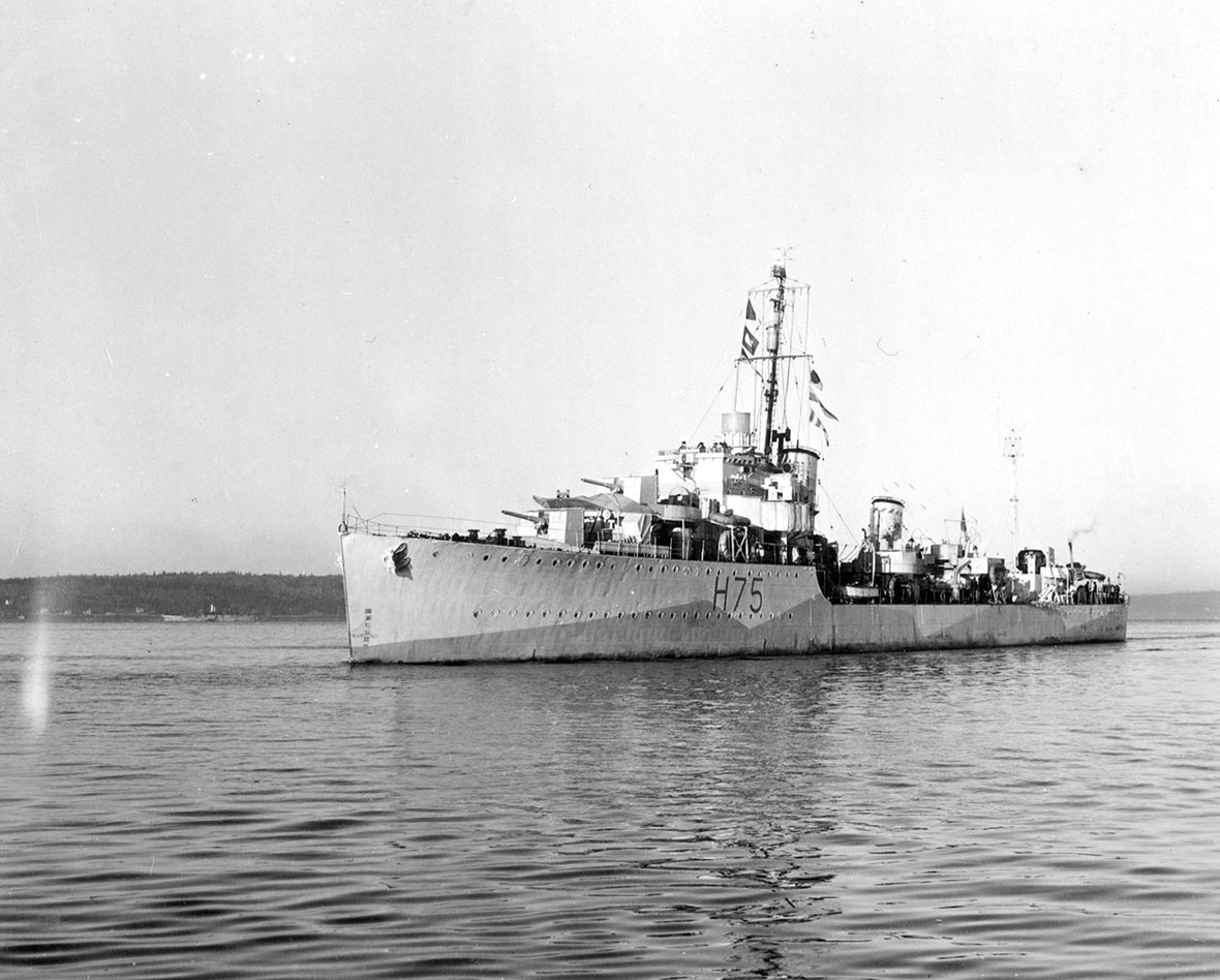Construit en 1933, le destroyer HMS Decoy de classe D faisait partie, lorsqu’éclata la guerre, de la 21e Flottille de destroyers de la flotte des Indes. Réaffecté en mai 1940 à la flotte méditerranéenne, ilfut endommagé par des bombes à Alexandrie, le 13 novembre. Il passa 10 semaines en radoub à Malte. Il participa à l’évacuation de la Grèce et de la Crète ainsi qu’à l’approvisionnement des troupes à Tobrouk, en Lybie. Le 12 avril 1943, il fut transféré à la Marine royale canadienne et devint le Kootenay. Après sa croisière d’endurance à Tobermory, en Écosse, il fut affecté au Groupe d’escorte C-5 de la Force d’escorte de haute mer et participa aux opérations du jour J. Dans les mois suivants, il effectua des patrouilles dans la Manche et dans le golfe de Gascogne et contribua à couler les sous-marins allemands U-678, U-621 et U-984. À la mi-septembre 1944, ilretourna au Canada où il subit des travaux de carénage et retourna au Royaume-Uni au printemps 1945. Après une croisière d’endurance à Tobermory, il exécuta des patrouilles depuis le port de Plymouth, en Angleterre, jusqu’à la fin de mai, puis rentra au Canada, où il effectua 6 allers-retours de transport de troupes entre Terre-Neuve et Québec. Le destroyer fut désarmé et placé en réserve à Sydney (Nouvelle-Écosse) le 26 octobre 1945 et, un an plus tard, il fut vendu à la ferraille.