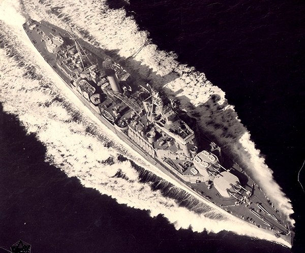 Le HMS Uganda, du nom éponyme de sa classe de croiseurs légers, sortit des chantiers navals de Vickers-Armstrong Ltd., à Newcastle-on-Tyne, Angleterre, le 3 janvier 1943. Après une croisière d’endurance au sein de la British Home Fleet (Flotte de guerre de la Marine royale britannique), l’Uganda fut intégré au Commandement de Plymouth en avril pour évoluer dans le golfe de Gascogne et dans la Manche, avant de se joindre au 15th Cruiser Squadron, British Mediterranean Fleet, dans le cadre de la Force K. Il fut gravement endommagé par une bombe planante lâchée par un avion allemand le 13 septembre 1943 pendant qu’il appuyait le débarquement allié à Salerne, Italie. Il arriva à Charleston, Caroline du Sud, en novembre pour y subir des réparations qui durèrent une année.