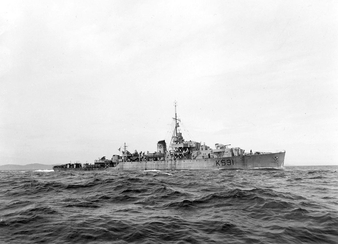 Le 12 mai 1945, le navire quitta Londonderry, Irlande du Nord, à destination du Canada pour escorter le convoi ONS.50 et, le 22 juillet, il entrait en carénage à Lunenburg, Nouvelle-Écosse. Les travaux furent suspendus le 24 août à la suite de la reddition du Japon; le navire fut désarmé le 13 novembre à Lunenburg, Nouvelle-Écosse, puis placé en réserve à Shelburne, Nouvelle-Écosse.