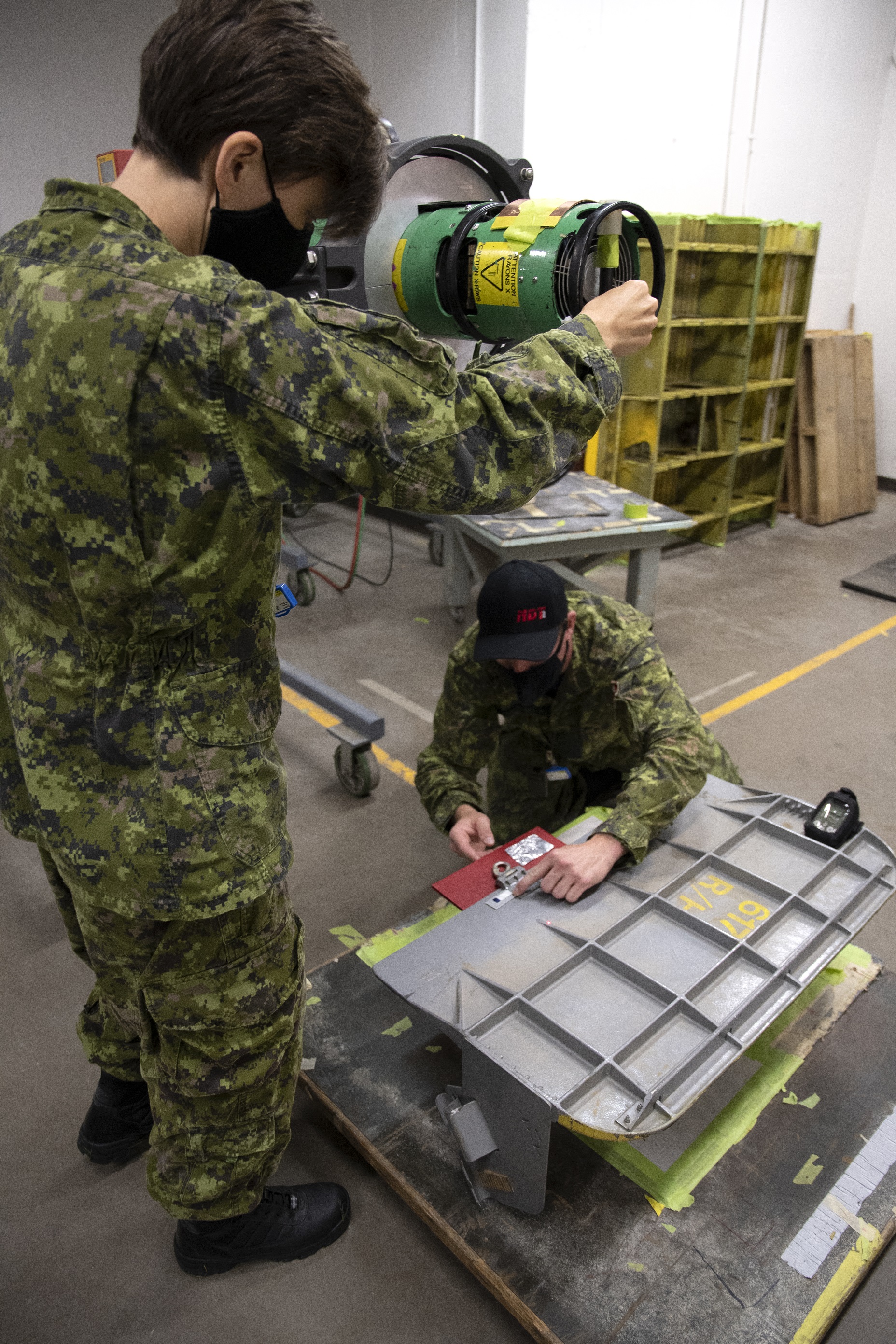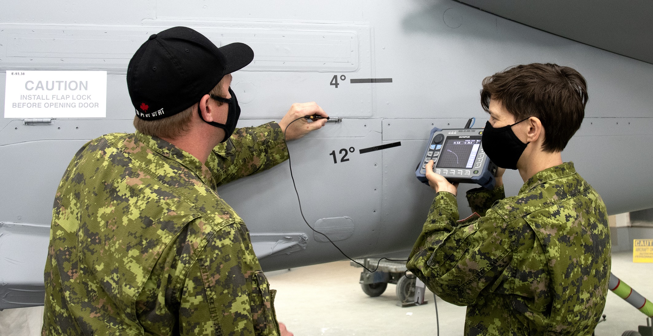 « Étant donné les coûts des aéronefs et de leurs composants ainsi que la forte demande pour des aéronefs en état de fonctionnement, il y a une préférence pour les essais non destructifs (END) plutôt que pour les essais destructifs », ajoute le commandant d’escadrille d’instruction de l’ESTTMA, le maj Ashley Oliver, officier du génie aérospatial (G AERO) possédant une formation spécialisée en END. « En fait, les essais non destructifs font régulièrement partie du programme de maintenance préventive de l’Aviation royale canadienne (ARC) pour chaque flotte. »