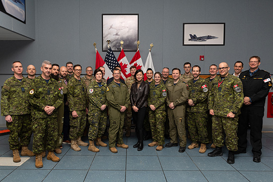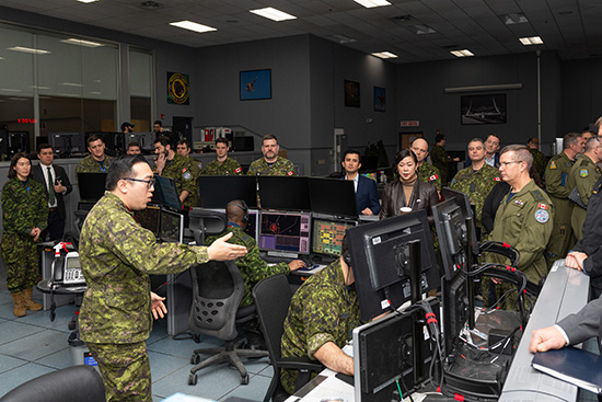 Le lieutenant-général Eric Kenny, commandant de l'Aviation royale canadienne, ainsi que des officiers militaires supérieurs canadiens et américains, la sous-ministre adjointe Natasha Kim sous-ministre déléguée de la Défense nationale, ainsi que des membres de la 22e Escadre et de l'équipe combinée de commandement et contrôle infonuagique, ont visité le centre des opérations à la 22e Escadre North Bay, le 25 janvier 2024.
