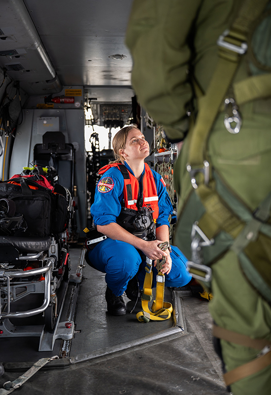 Le 9 septembre, Mme Gibbons, docteure en ingénierie, s’est jointe au 442e Escadron pour participer à l’évacuation sanitaire réelle d’un patient depuis le navire de croisière MS Queen Elizabeth, à 20 kilomètres à l’ouest de l’île Nootka. À bord de l’hélicoptère CH-149 Cormorant, elle a pu observer de près la coordination entre le personnel navigant et les techniciens SAR pendant qu’ils dispensaient des soins médicaux en vol.
