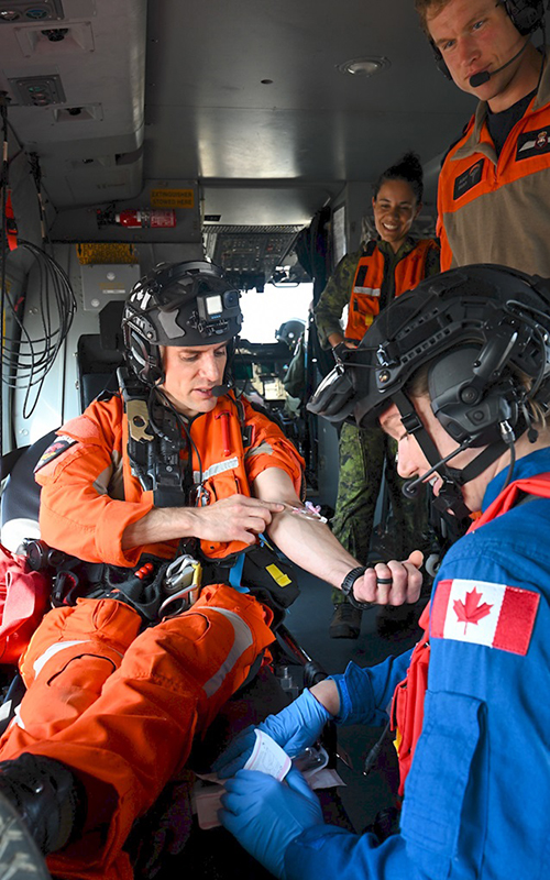 L’astronaute de l’Agence spatiale canadienne, le docteur Jenni Gibbons, s’entraîne à réaliser des procédures intraveineuses à bord d’un CH-149 Cormorant lors de sa visite à la 19e Escadre Comox, en Colombie-Britannique, le 8 septembre 2025.