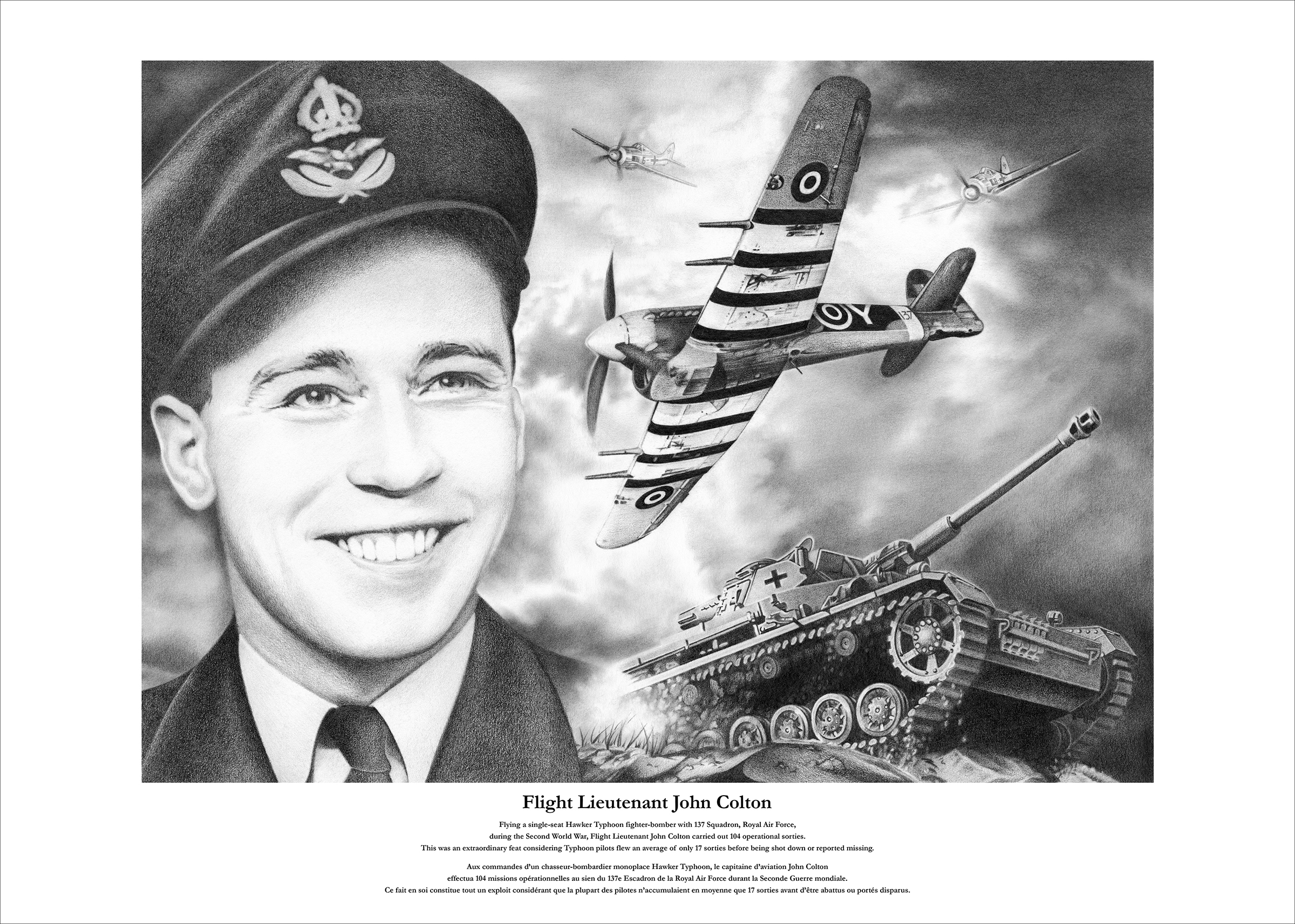 Le capitaine d’aviation John Colton faisait partie de l’Aviation royale du Canada en tant que pilote de chasseurs-bombardiers Hawker Typhoon du 137e Escadron de la Royal Air Force pendant la Seconde Guerre mondiale. Il s’est enrôlé à seulement 19 ans et, à la fin de la guerre, il avait effectué un nombre incroyable de sorties opérationnelles, soit 104. En moyenne, les pilotes de Typhoon ne faisaient que 17 sorties avant d’être tués, abattus ou portés disparus. Au cours de son service, le capitaine d’aviation Colton a piloté dans le cadre d’opérations bien connues et dangereuses, notamment l’invasion de la Normandie, la bataille de la poche de Falaise et l’opération Market Garden.