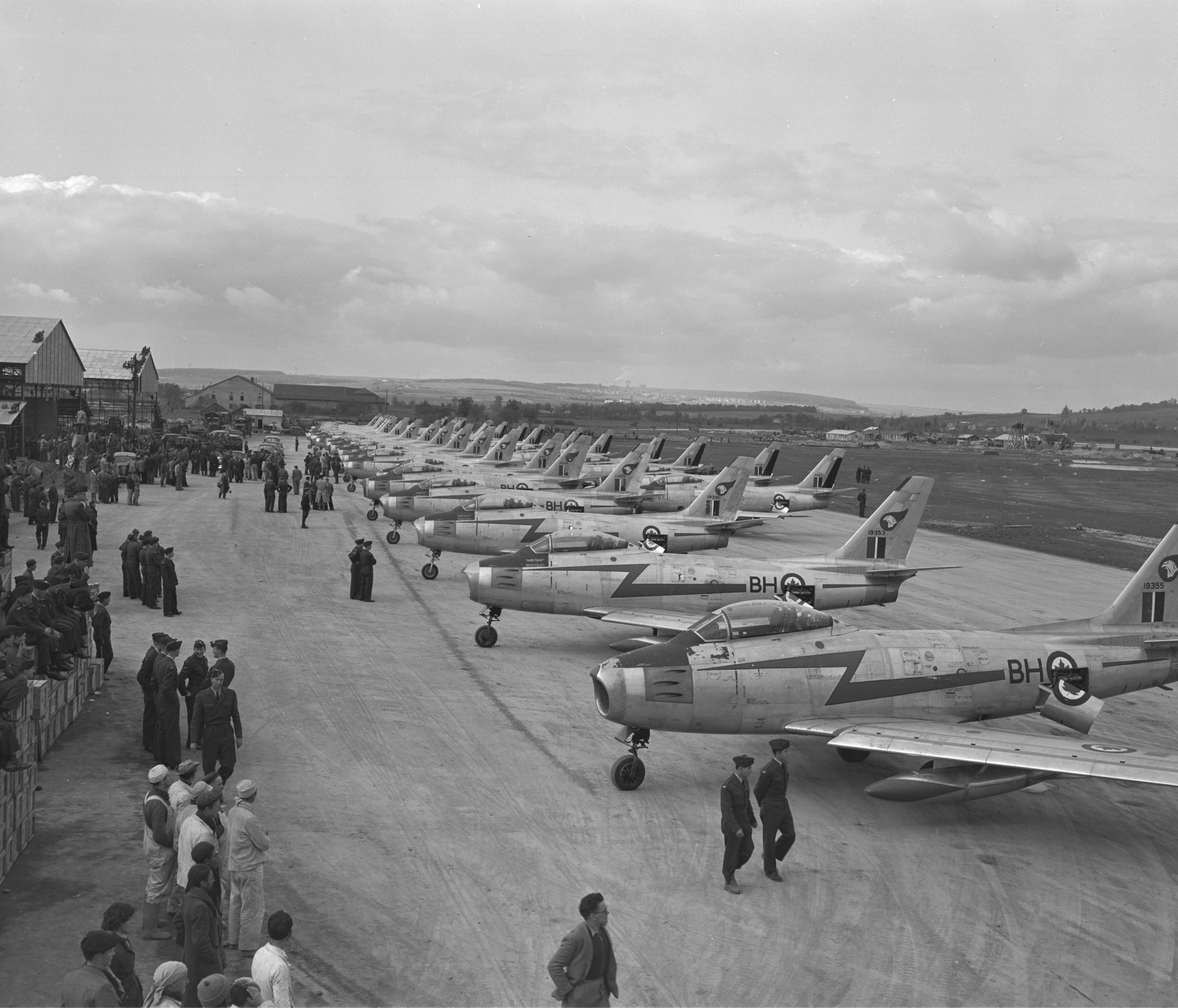 La première base de l’ARC à l’étranger en temps de guerre voit le jour à North Luffenham, en Angleterre, quand le 1er Escadron de chasseurs embarque ses aéronefs F-86 Sabre, de fabrication canadienne, à bord du navire canadien de Sa Majesté (NCSM) Magnificent, en novembre 1951. Des mois plus tard, le 441e Escadron arrive à North Luffenham. En juin 1952, le troisième escadron atterrit à l’étranger dans le cadre de l’opération historique Leap Frog One, au cours de laquelle les Sabre de l’escadron se transportent en Europe par la voie des airs depuis Bagotville, au Québec, en faisant escale à Goose Bay, au Labrador, au Groenland et en Islande.