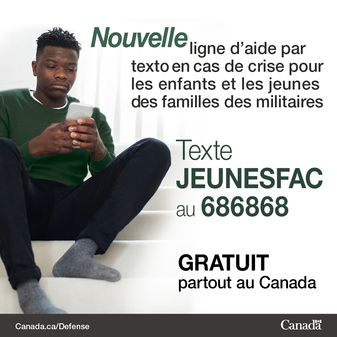 Un service personnalisé de textos a été mis en place pour les 78 000 enfants et adolescents des membres des Forces armées canadiennes (FAC). Le service d’aide en cas de crise par textos, mis en place par Jeunesse, J’écoute, est un service de textos exclusif qui permettra à tous les enfants des familles de militaires d’avoir accès à un soutien gratuit en matière de santé mentale et de bien‑être, en anglais et en français.