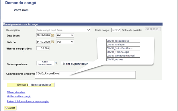 S’il vous plaît prendre note que l’approbation du code 699 se fait sur une base de cas par cas, les gestionnaires doivent contacter l’équipe de RT pour chaque cas soumis afin d’obtenir des avis et conseils. Votre employé et vous devriez avoir discuté de l’utilisation de ce code ainsi que de la raison précise avant de soumettre sa demande. Avant d’approuver une demande de congé sous le code 699 Covid soumise par un de vos employés, assurez-vous que ce dernier ait bien inscrit une des raisons de la liste approuvée ci-dessous, dans la case « Commentaire de l’employé » comme indiqué dans l’exemple ci-dessous. Si la demande concerne une demande pour raison de Covid et que la case commentaire est vide, « refuser » la demande de congé et demandez à votre employé de modifier sa demande et d’y indiquer la raison, dans la case « Commentaire de l’employé » pour laquelle vous vous êtes entendu durant votre discussion et resoumettre sa demande. L’épellation de la raison dans la case commentaire devra être identique à un item de la liste ci-dessous. Un « Copier/Coller » à partir de la liste est la meilleure façon de vous assurer que vous respectez les mêmes épellations et formats.
