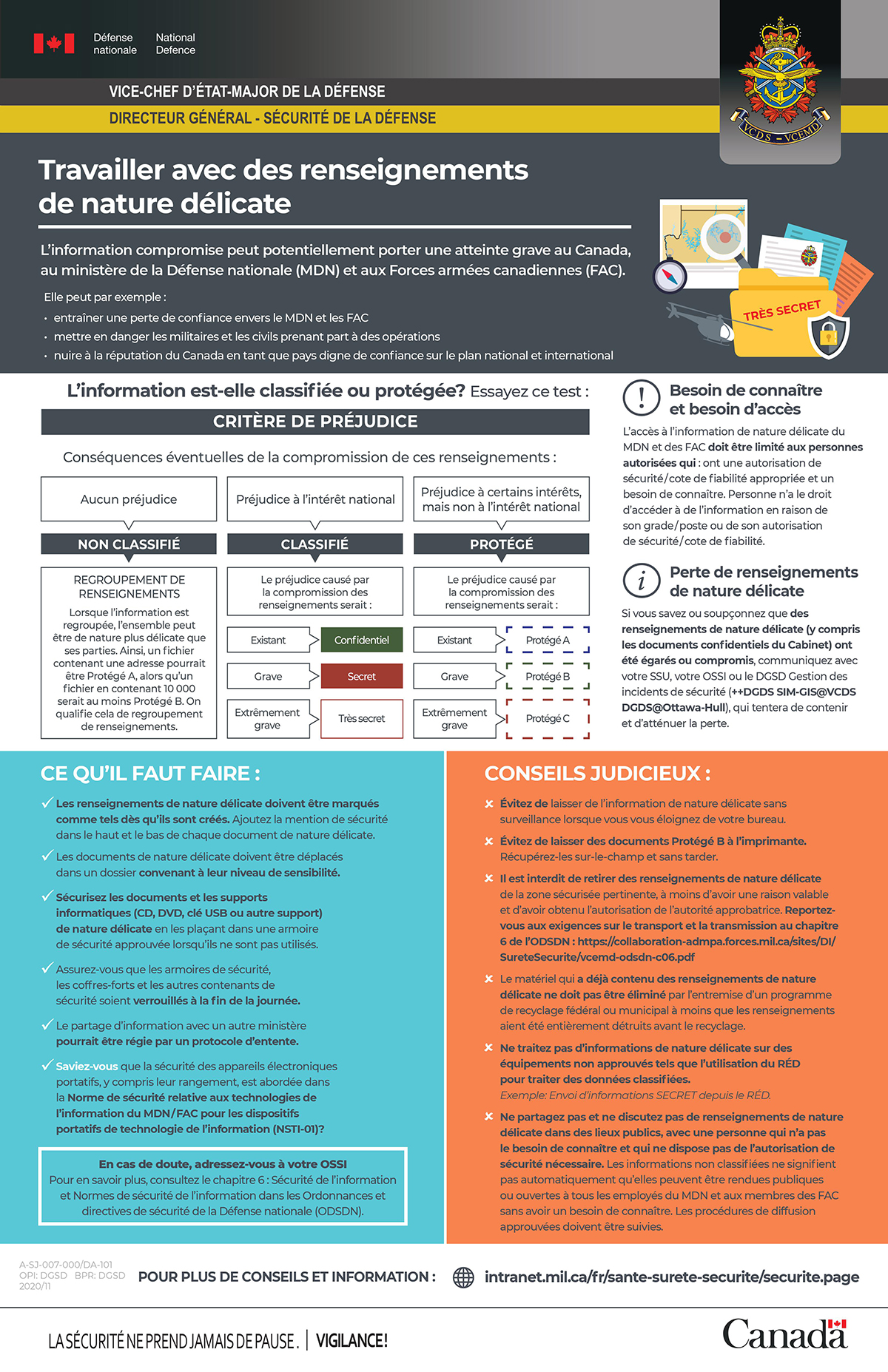 Traitez-vous de l’information de nature délicate? Faites le test pour établir si les renseignements que vous traitez sont classifiés ou protégés, et voyez nos conseils sur les choses à faire et à ne pas faire lorsqu’on traite de l’information de nature délicate.