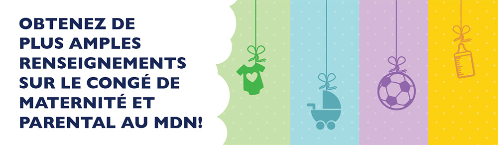 La nouvelle trousse d’outils pour le congé de maternité/parental (accessible uniquement sur le réseau de la Défense nationale) non payé vous fournit des renseignements complets, comme des conseils pour vous préparer à votre congé, les étapes à suivre pour obtenir la couverture médicale souhaitée, des renseignements pour obtenir des prestations de l’assurance-emploi ou du Régime québécois d’assurance parentale, en plus de vous assurer un retour au travail réussi, y compris le rétablissement de votre paye.