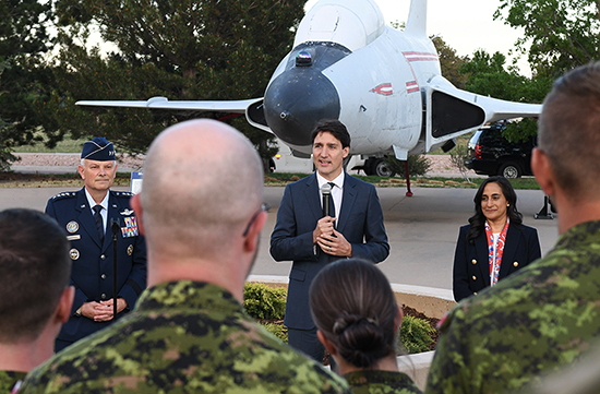 Le très honorable Justin Trudeau, premier ministre du Canada, s'adresse à un rassemblement de membres des Forces armées canadiennes au Peterson Air and Space Museum sur la base spatiale de Peterson, au Colorado, le 7 juin 2022.
