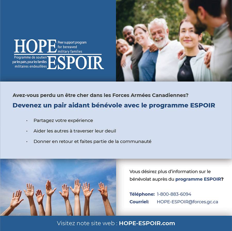 Avez-vous vécu la perte d’un être cher ayant servi dans les FAC? Le programme ESPOIR vous invite à faire une différence positive dans la vie d’autres personnes, et un petit investissement de votre temps suffit. En tant que bénévole du programme ESPOIR, vous aurez l’occasion de tisser des liens et de redonner à la communauté des familles de militaires. Pour en savoir plus sur la façon de procéder pour participer au programme, veuillez téléphoner au 1-800-883-6094 ou envoyer un courriel à l’adresse suivante : HOPE-ESPOIR@forces.gc.ca.