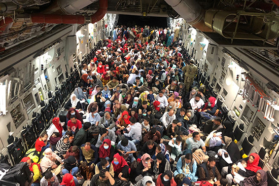 « Les Afghans qui gravissaient la rampe du Globemaster avaient tous l’air épuisés, et pour bon nombre d’entre eux, seule l’adrénaline les poussait à avancer. La plupart d’entre eux n’emportaient aucun bien, sauf les documents leur permettant de quitter Kaboul. Ceux et celles qui avaient réussi à emporter leurs biens n’avaient généralement rien de plus qu’une valise pour la famille tout entière, et certains passagers étaient des enfants. »