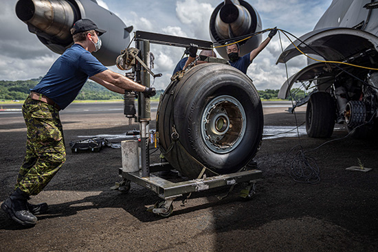 Le caporal Mackenzie Birch, le sergent James Mercer et le caporal Xiao-Hua Huang changent deux pneus arrières d’un avion CC-177 Globemaster à l’aéroport international Panamá Pacífico dans la ville de Panama, au Panama, avant le transport aérien stratégique de fournitures médicales et d’aide humanitaire en lien avec la COVID-19 vers des pays de l’Amérique latine et des Caraïbes, dans le cadre de l’opération GLOBE 20-02, le 28 juillet 2020.