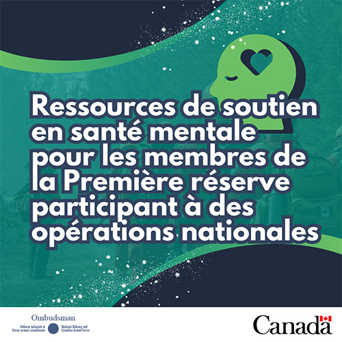 Donc vous devez être conscient des avantages et des ressources dont vous disposez avant, pendant et après des opérations nationales. Pour en savoir plus, consultez le site Web du bureau de l’Ombudsman du MDN et des FAC qui offre une page sur les Ressources de soutien en santé mentale destinés aux membres de la Première réserve participant à des opérations nationales.