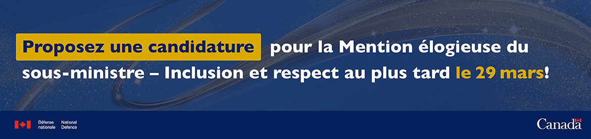 Quelle meilleure façon de faire les deux en proposant la candidature d’un collègue ou d’une équipe qui ont contribué à l’environnement de travail inclusif, respectueux et sécuritaire de l’Équipe de la Défense à une mention élogieuse du Sous-ministre (SM)?