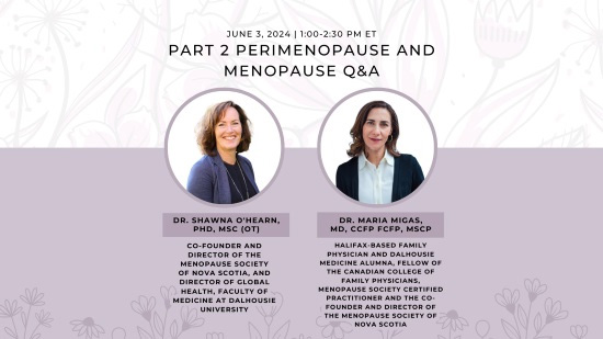 - Dre Shawna O’Hearn, PhD, MSc (OT), cofondatrice et directrice de la Société de ménopause de la Nouvelle-Écosse, et directrice de la santé mondiale, Faculté de médecine de l’Université Dalhousie