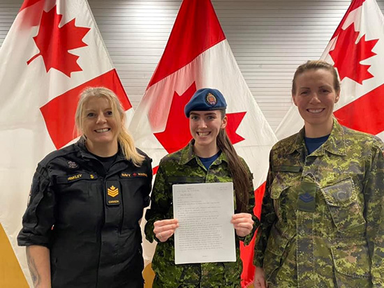 En compagnie de son encadreuse, la caporale-chef Doyle (à droite), et de sa superviseuse, la maître de 2e classe Hinkley (à gauche), l’aviatrice Jesso reçoit son message d’affectation et atteint le niveau opérationnel de compétence. En tant que l’une des premières personnes à réussir le projet pilote « Apprentissage en milieu de travail », elle confie que son expérience a été favorable pour intégrer les FAC, l’incitant aussi à corédiger le présent article..