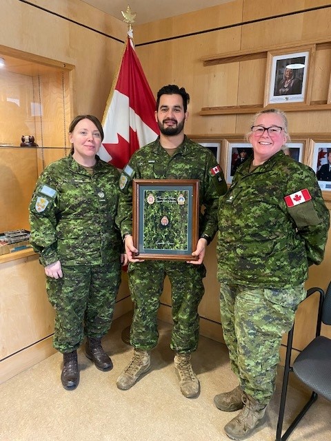En compagnie de l’adjudante-maître Brake (à gauche) et de la majore Henwood (à droite), le soldat Sidhu (au centre) reçoit son message d’affectation et atteint le niveau opérationnel de compétence. En tant que l’une des premières personnes à réussir le projet pilote « Apprentissage en milieu de travail », ce dernier affirme que l’expérience a été favorable pour intégrer les FAC, l’incitant aussi à corédiger le présent article.