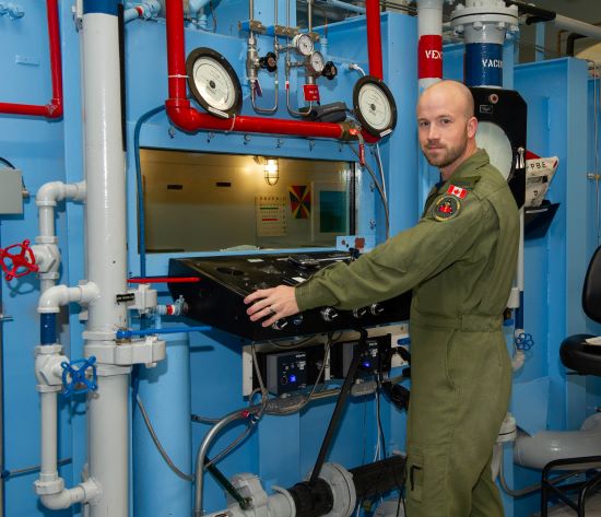 Un membre des forces armées canadiennes manipule une grosse machine tout en regardant par-dessus son épaule.