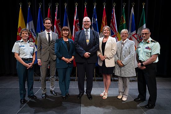Le Comité directeur du Canada sans Faille (CDCSF) a tenu sa conférence annuelle au Musée canadien de la guerre à Ottawa le 22 mai, 2024. De la gauche : Commandant par intérim du Commandement du personnel militaire et Chef du personnel militaire Lgén Lise Bourgon, députée à l’Assemblée législative du Manitoba M. David Pankratz, Secrétaire parlementaire Marie-France Lalonde, min DN Bill Blair, l’honorable Mary Wilson, l’honorable Barbara Adams, Directeur générale personnel militaire – Stratégique, Mgén Stéphane Boivin.