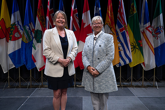 L’honorable Mary Wilson, députée à l’Assemblée législative au Nouveau-Brunswick (G), remet la présidence provinciale du Comité directeur du Canada sans Faille (CDCSF) à l’honorable Barbara Adams, députée à l’Assemblée législative à la Nouvelle-Écosse lors de la Conférence annuelle du CDCSF à Ottawa le 22 mai, 2024.