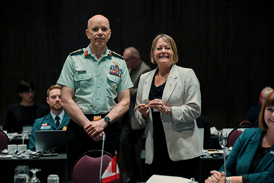 Le Chef d’état-major de la Défense du Canada (CEMD) Général Wayne Eyre présente son médaillon du commandant à l’honorable Mary Wilson, la présidente provinciale sortante du Comité directeur du Canada sans Faille (CDCSF), lors de la Conférence annuelle du CDCSF à Ottawa le 22 mai, 2024. Le médaillon a été accordé en reconnaissance d’un service remarquable au sein des Forces armées canadiennes comme étant la co-présidente du CDCSF de juin, 2022 à mai, 2024.