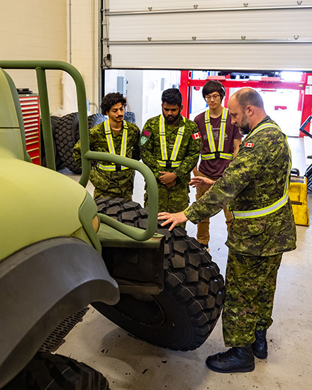 un technicien automobile, debout devant trois autres militaires, regardant un pneu.