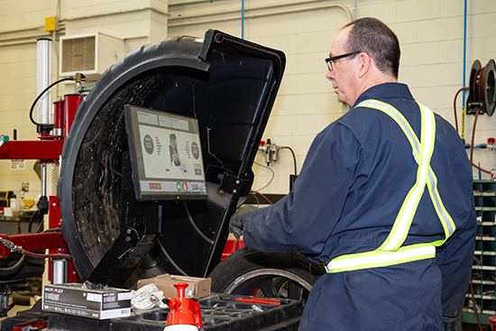 Un technicien automobile de la BFC Halifax équilibre les pneus d'un véhicule militaire.