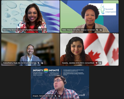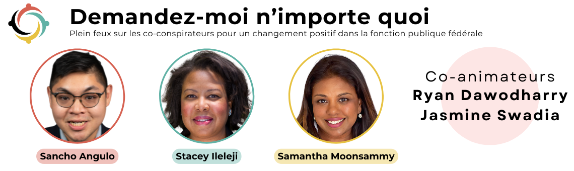 Intitulé « Plein feux sur les co-conspirateurs pour un changement positif au sein de l'Équipe de la défense et de la fonction publique fédérale », les panélistes Sancho Angulo, Stacey Ileleji et Samantha Moonsammy ont tenu une discussion importante et animée, modérée de manière réfléchie par Ryan Dawodharry et Jasmine Swadia.