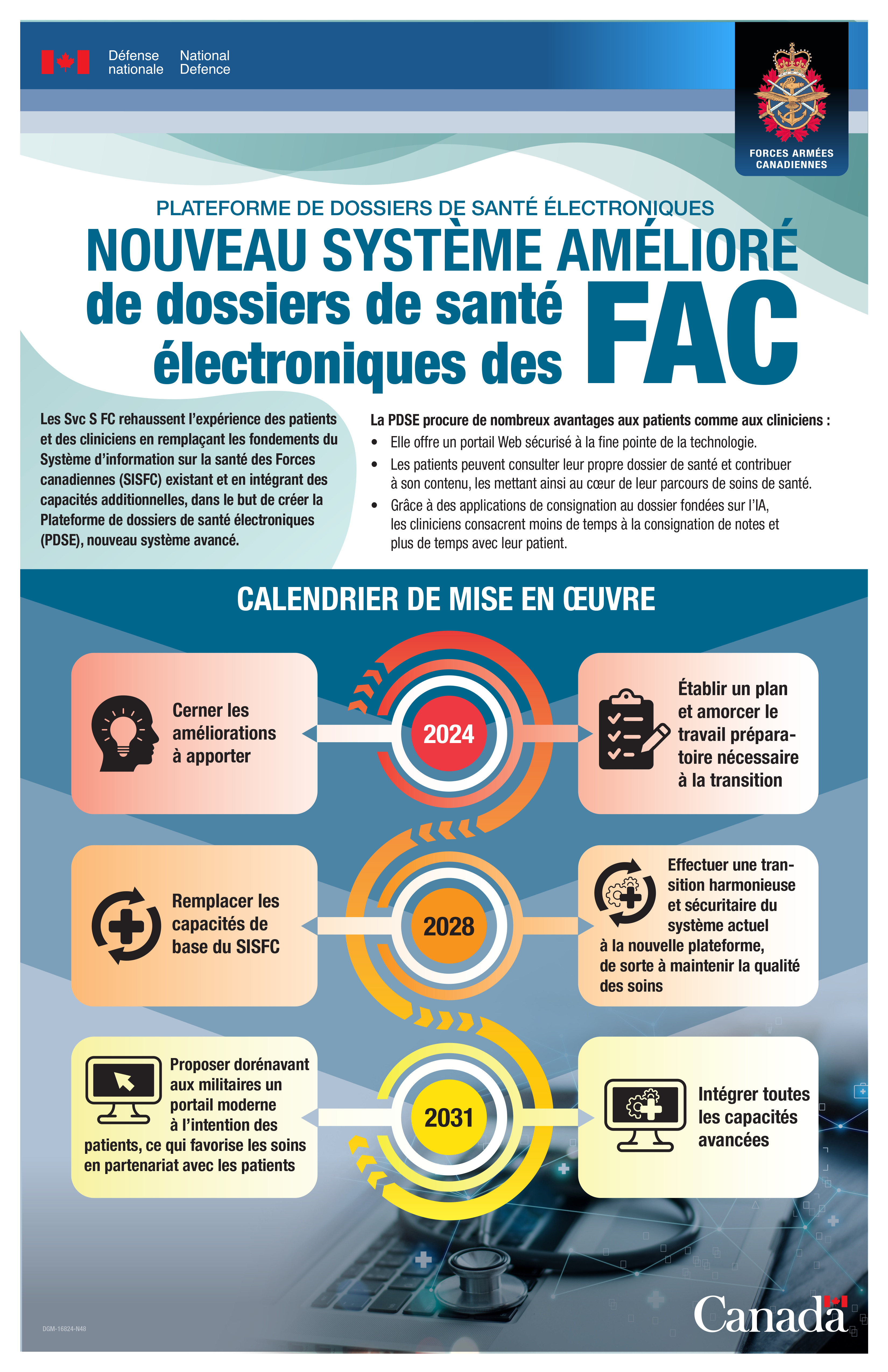 La mise à niveau de l’actuel Système d’information sur la santé des Forces canadiennes (SISFC) pour en faire une nouvelle plateforme améliorée – la plateforme de dossiers de santé électroniques (PDSE) – sera effectuée par une migration de données harmonieuse. Durant le transfert, les renseignements sur la santé des patients demeureront sécurisés et privés, et les soins offerts aux patients ne seront pas perturbés. Cette transformation procurera des avantages majeurs tant aux patients qu’aux cliniciens, tout en assurant la sécurité et la protection des renseignements personnels sur la santé de chacun des patients.