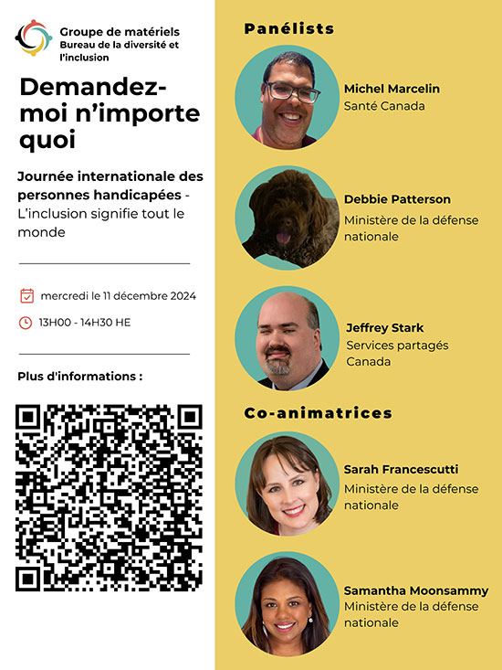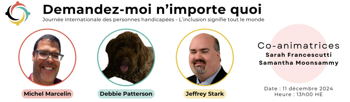 Rejoignez-nous pour une session « Demandez-moi n'importe quoi » à l'occasion de la Journée internationale des personnes handicapées! Cet événement est une occasion unique d'explorer et de discuter de sujets liés à l'accessibilité, à l'inclusion et à la défense des personnes handicapées. Des défenseurs et des personnes ayant vécu de nombreuses expériences répondront à vos questions, partageront leurs points de vue et discuteront des moyens de créer un monde plus inclusif. Que vous souhaitiez en savoir plus sur les droits des personnes handicapées, la conception inclusive ou les histoires personnelles, cette session interactive est ouverte à tout le monde et encourage la participation de tous. Ne manquez pas cette occasion de vous connecter, d'apprendre et de défendre l'accessibilité pour tous!