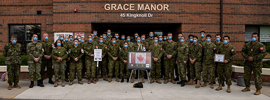 Des membres du 4e Groupe des Services de santé des Forces canadiennes et du 1er Groupement tactique territorial des Forces armées canadiennes qui représentent l’indicatif d’appel 1-1 sont rassemblés pour une photo de groupe au Holland Christian Homes, à Brampton, en Ontario, le 25 mai 2020, où ils ont prêté main-forte à l’établissement de soins de longue durée au cours de l’opération LASER.