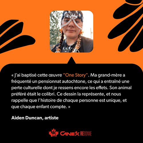 « J'ai baptisé cette œuvre “One Story”. Ma grand-mère a fréquenté un pensionnat autochtone, ce qui a entraîné une perte culturelle dont je ressens encore les effets. Son animal préféré était le colibri. Ce dessin la représente, et nous rappelle que l’histoire de chaque personne est unique, et que chaque enfant compte. » Aiden Duncan, artiste.