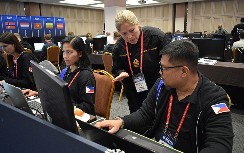 La capitaine de frégate Kathryn Aubrey-Horvath fournit des conseils juridiques aux experts en cyber des Forces armées des Philippines alors qu’ils analysent un scénario stratégique lors de l’exercice APEX 2025.