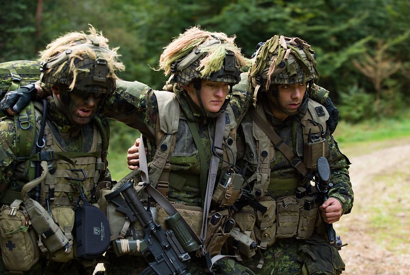 Des membres du 1er Bataillon du Princess Patricia's Canadian Light Infantry aident à l’évacuation d’un pseudo blessé au cours de l’exercice ALLIED SPIRIT V, dans la zone d’entraînement de Hohenfels, en Allemagne, le 9 octobre 2016, dans le cadre de l’opération REASSURANCE.