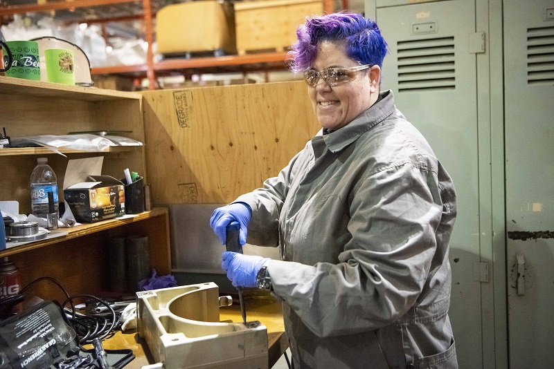 À l'IMF Cape Scott à Halifax, Angela Bezanson, mécanicienne industrielle titulaire d’un certificat portant le Sceau rouge, est l'une des nombreuses femmes parmi les quelque 1 200 employés qualifiés de la flotte de l'Atlantique. Elle travaille à l’IMF depuis 12 ans et, à titre de technicienne mécanicienne de marine, et s'occupe de l'entretien des systèmes d'armes sous-marins que l'on trouve à bord des navires et des sous-marins canadiens de Sa Majesté.