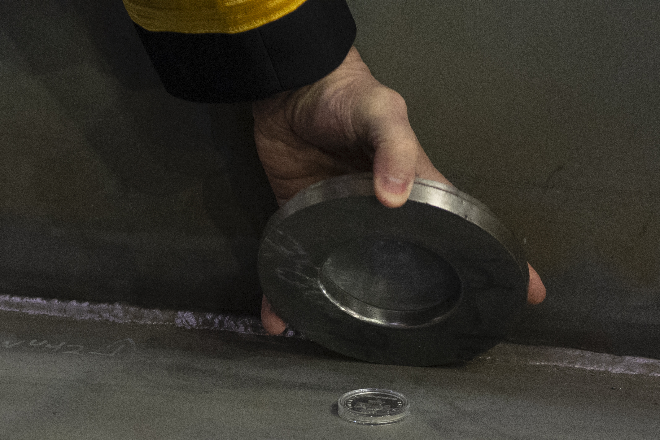 La pièce a été placée dans une boîte, que le Cam Santarpia a posée sur le navire, et chaque constructeur de navire a effectué une soudure par point pour que le tout reste bien en place. M. Mooney a ensuite déclaré que la quille était « bel et bien posée ».