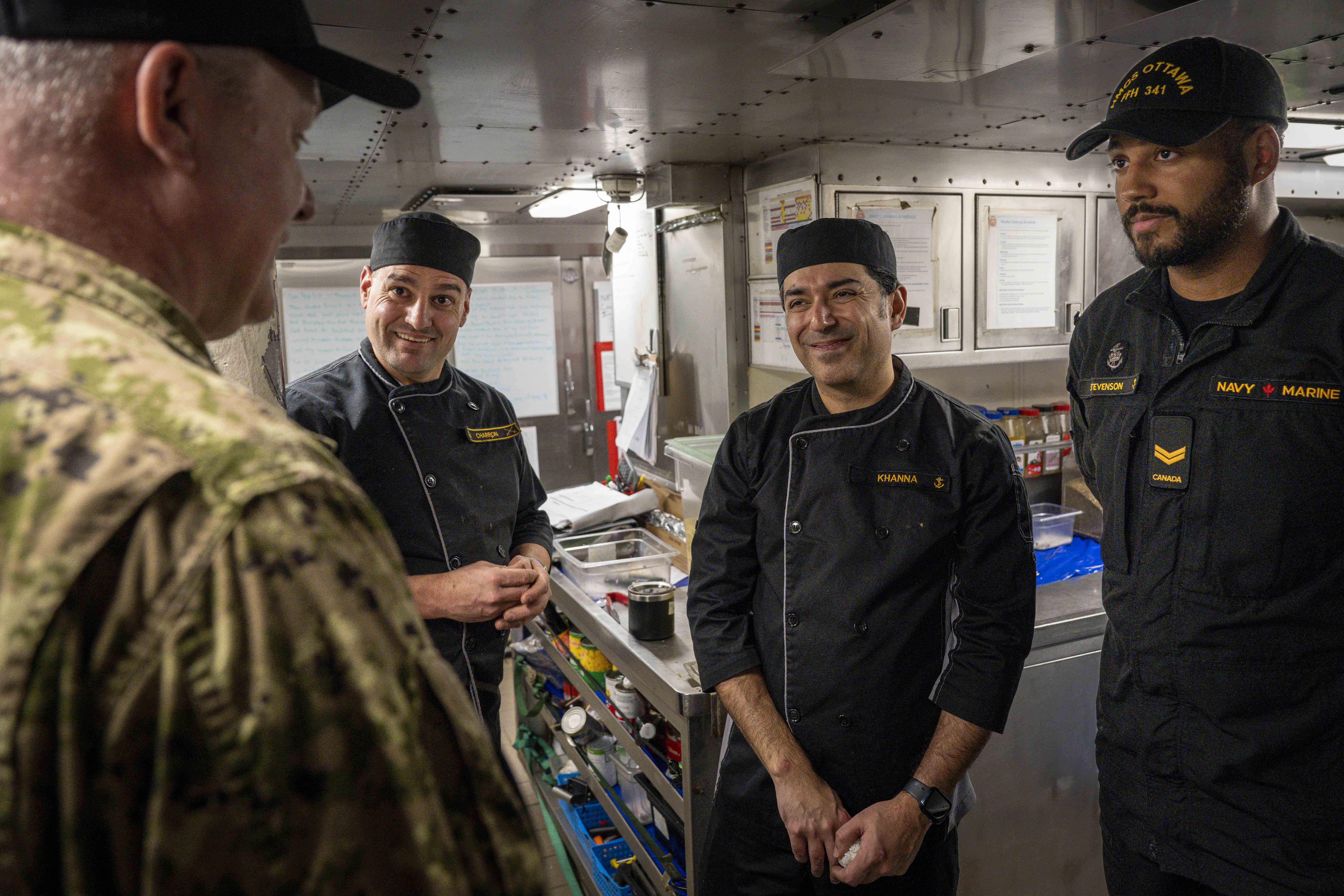 L’adjudant-chef des Forces armées canadiennes Bob McCann discute avec le caporal‑chef Marc‑André Charron, les matelots de 1re classe Amit Khanna et Prince Stevenson lors de sa visite à bord du NCSM Ottawa (FFH 341) à Yokosuka, au Japon, le 22 novembre 2024.