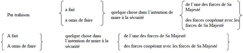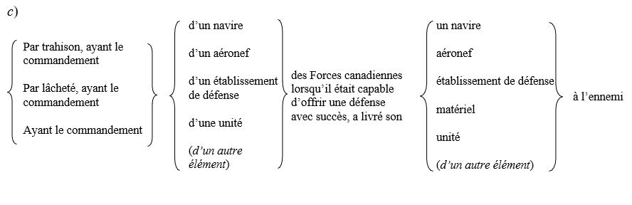 (C) L'article 135 de la Loi sur la défense nationale s'applique aux situations où la peine maximale varie selon les circonstances. Par exemple, l'emprisonnement à perpétuité sera la peine prévue si l'acte est de la nature de la trahison mais une peine moins grave, pouvant aller jusqu'à l'emprisonnement à perpétuité, sera la peine prévue en l'absence de trahison. Lorsqu'une personne est accusée d'avoir commis un acte avec l'intention de trahir et que le tribunal constate que la preuve démontre qu'elle a commis l'acte mais sans intention de trahir, le tribunal peut signaler ce fait dans son verdict. Un tel verdict constitue un verdict de culpabilité mais n'entraîne pas la peine au degré supérieur qu'aurait entraînée l'accusation initiale.