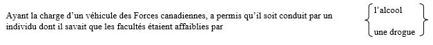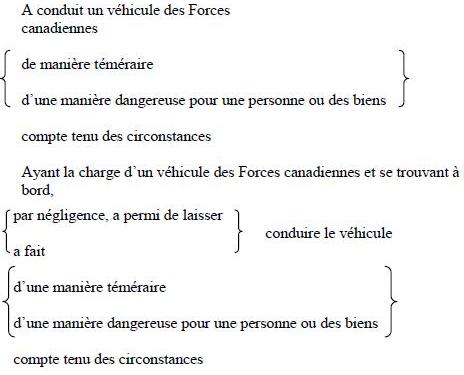 Une infraction punissable selon l'article 130 de la Loi sur la défense nationale, soit (indiquez l'infraction) contrairement à (indiquez la disposition qui établit l'infraction).