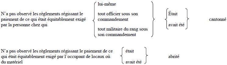 Une infraction punissable selon l'article 132 de la Loi sur la défense nationale, soit (indiquez l'infraction) contrairement à (indiquez la disposition qui établit l'infraction).