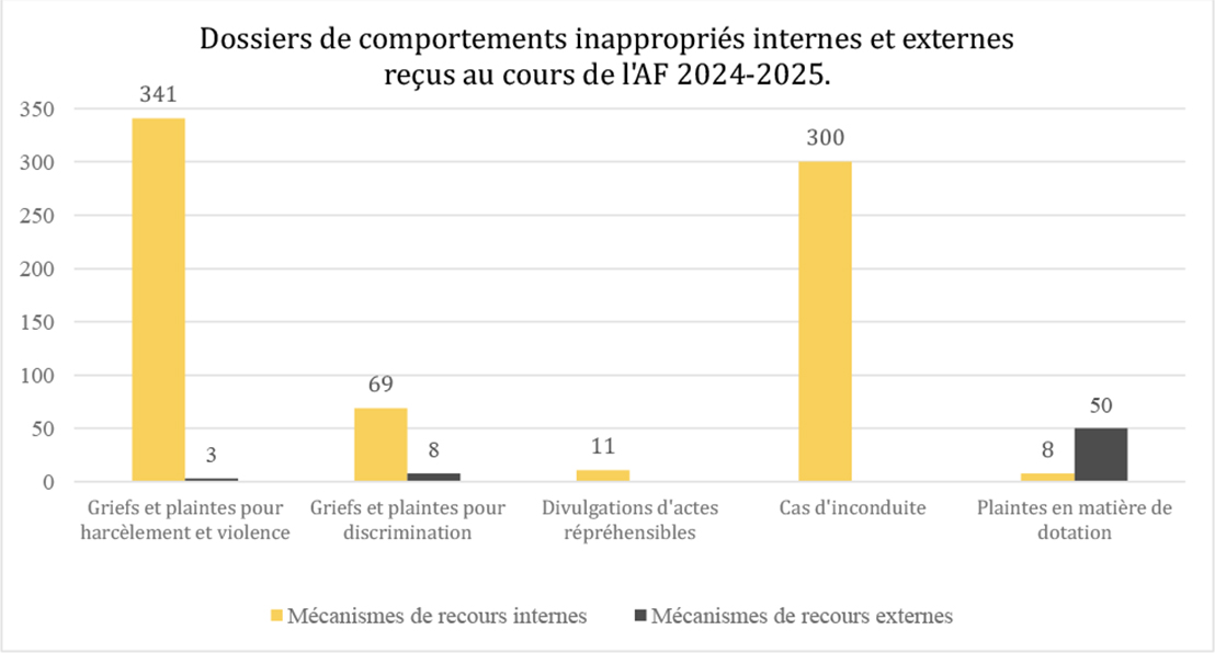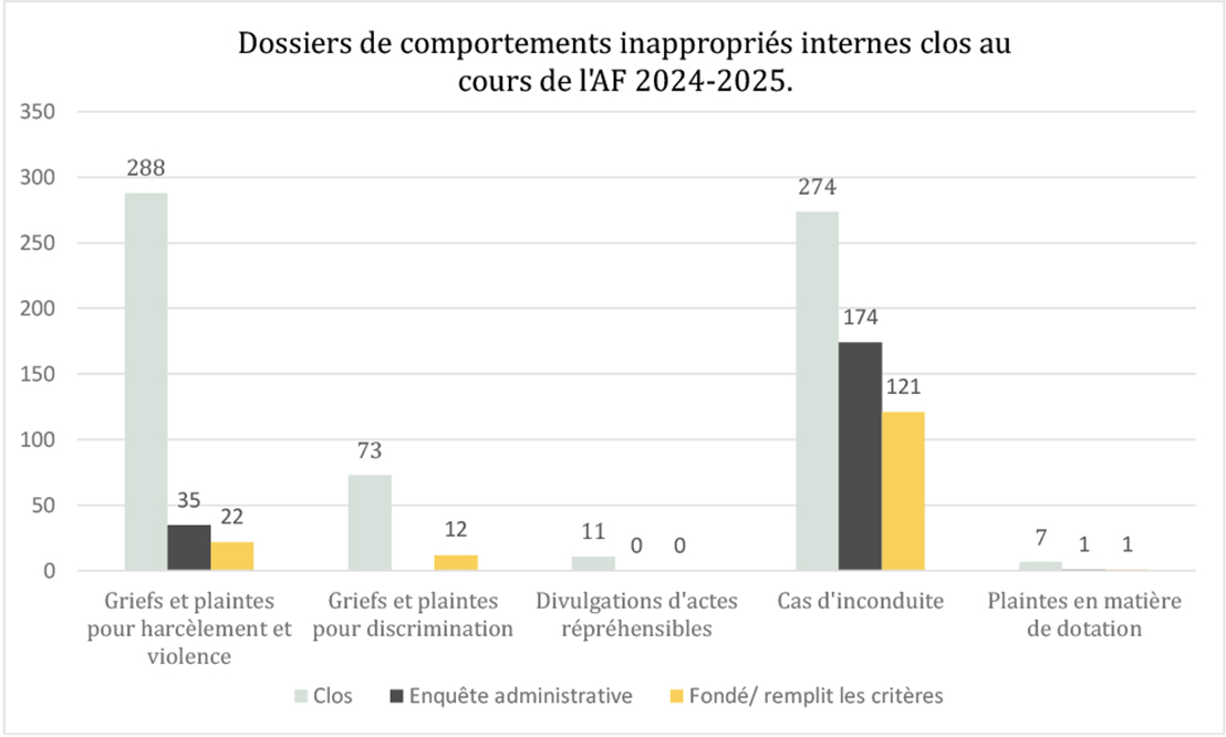 Au cours de l’AF 2024-2025, le MDN a reçu 729 dossiers de comportements inappropriés au moyen d’un large éventail de mécanismes de recours et de plainte internes. Il s’agit notamment de plaintes pour harcèlement et violence en milieu de travail, de plaintes pour harcèlement et discrimination, de divulgations d’actes répréhensibles, de cas d’inconduite et de plaintes en matière de dotation.