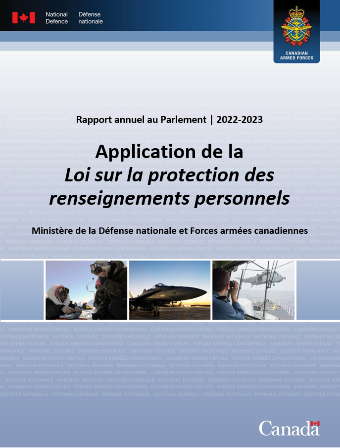 Le ministère de la Défense nationale et les Forces armées canadiennes sont heureux de présenter au Parlement leur rapport annuel sur l’application de la Loi sur la protection des renseignements personnels (LPRP). L’article 72 de la Loi précise que, à la fin de chaque année financière (AF), le responsable de chaque institution fédérale doit présenter au Parlement, un rapport annuel sur l’application de cette loi. Ce rapport décrit les activités menées par la Défense nationale pour assurer la conformité aux dispositions de la Loi sur la protection des renseignements personnels au cours de l’année financière allant du 1er avril 2022 au 31 mars 2023.