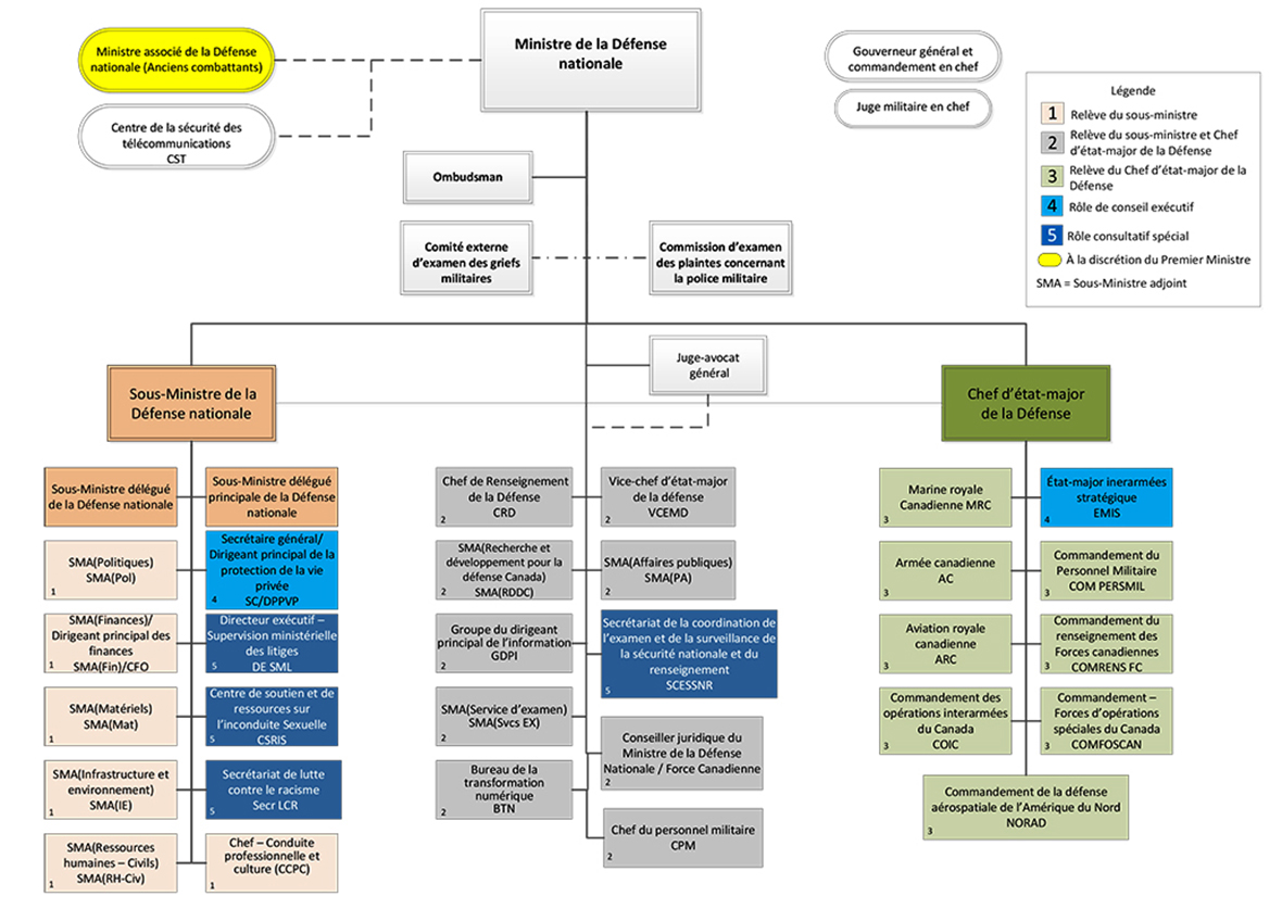 - Juge-avocat général (fournit des services juridiques au sous-ministre et au chef d'état-major de la Défense, mais relève du ministre de la Défense nationale pour l'exécution de ses tâches)